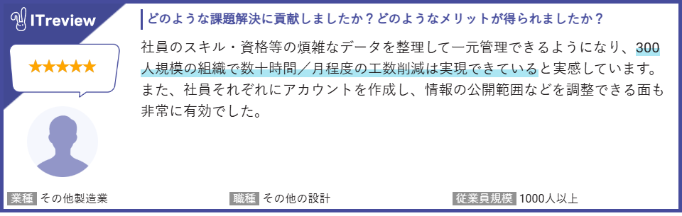 製造業のスキルマネジメントやスキルベース組織に関するユーザーレビューで高評価を獲得